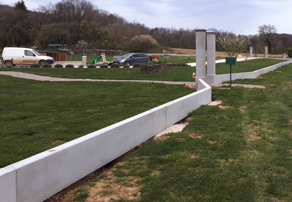 Mur de clôture préfabriqué en béton armé monobloc. Une face finition béton lisse, l’autre face finition béton brut.