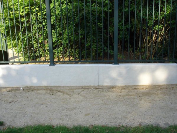 Mur de clôture en béton préfabriqué (pierre reconstituée), muret monobloc droit, aspect grenaillé.